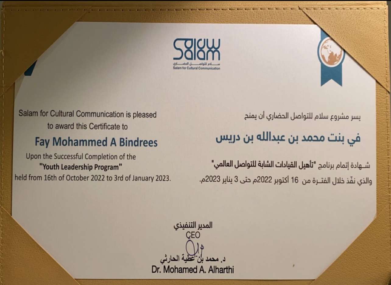 The student, Fay Mohammed Bindrees, participated among selected participants in a program to empower youth leaders at Salam program for cultural communication in its fifth edition, affiliated with the King Abdulaziz Center for National Dialogue. Salam program is a national project established by the Saudi Council of Ministers on October 26, 2015. It aims to spread the message of cultural peace and connection, build bridges of communication between diverse communities and cultures, and enhance the positive image of Saudi Arabia and its position internationally.
